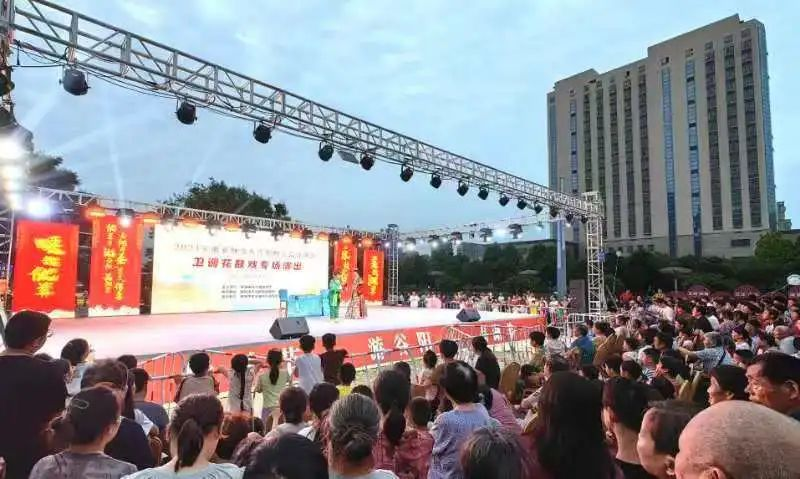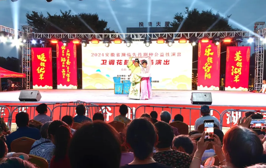 7月15日傍晚,2024安徽•固镇伏羊节文艺演出活动引入安徽省濒临失传剧种卫调花鼓戏专场演出。在传统淮河文化韵味十足的戏曲声中,蚌埠市龙子湖区卫调花鼓戏剧团的演员们以传统民间戏曲的艺术形式,用通俗易懂的台词、抑扬顿挫的唱腔,塑造着灵动鲜活、栩栩如生的人物形象,为现场观众带来了一场传统文化的视听盛宴,演出现场欢声不断,掌声雷动。