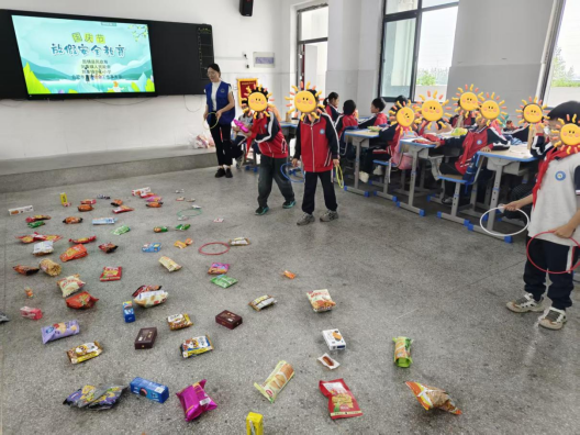 知识宣讲环节结束后,教室瞬间变成了热闹的“欢乐套圈场”。社工与学校老师把各类零食——酥脆的膨化食品、酸甜的果脯、松软的糕点等,满满当当地铺在地面上。孩子们拿着彩色套圈,排着队兴奋等候,轮到自己时,便认真瞄准、果断投掷。套中零食的孩子举着“战利品”笑出小虎牙,没套中的也不气馁,朝着同伴喊着“加油”,整个教室被欢笑声填得满满当当,安全知识也在这欢乐氛围里悄悄印入孩子们心底。
