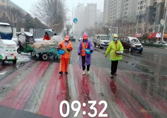 人工融雪补位,筑牢夜间出行安全屏障。针对夜间低温可能导致路面结冰的风险,人工融雪作业同步全面铺开。当日全天,在环卫管理中心统一调度下,城区市场化保洁公司——明日环境组织200余人次作业人员顶风冒雪,对城区主次干道等重点区域精准撒布融雪剂10余吨。作业人员严格按照科学配比投放融雪物资,重点加大对易结冰路段的撒布频次,最大限度降低夜间低温对路面的影响,有效预防路面冰冻层形成,切实保障群众夜间及次日出行安全。