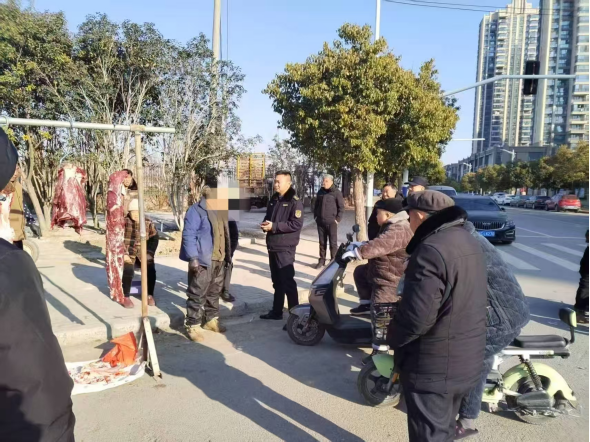 整治重点路口,规范经营秩序。连日来,返乡车流、人流持续叠加,杨庙路、朝阳路、汉兴大道等城区重点路口作为返乡群众进出城的核心通道,人流量增长较大。个别商户瞅准“商机”,在路口转角、人行道甚至机动车道边缘占道售卖牛羊肉等年节商品,挤占行人通行空间,存在安全隐患。对此,执法人员严格落实“721”工作法,以劝导教育为主,向商户阐明占道经营可能引发的交通安全风险,争取当事人的理解与配合。累计规范取缔占道肉摊80余处,有效维护了重点路口的经营秩序与道路畅通。