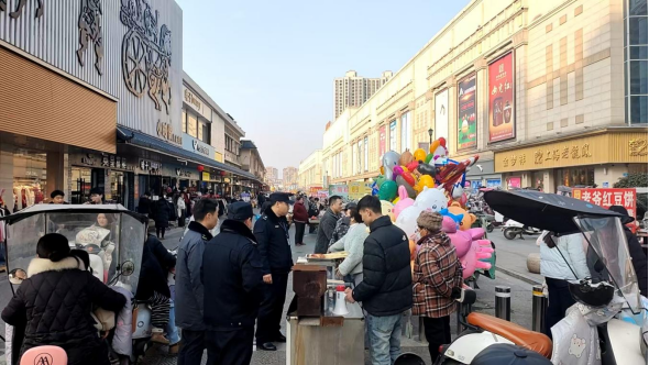 驻守核心商圈,畅通城市脉络。黄桥路步行街作为我县商业中心,连日来人流如织,与浍河路交口的白马路口更是商贩云集,严重影响道路通行。县城市管理局实行定人、定点、定岗的“三定”管理模式,安排执法人员错时值守,重点对氢气球售卖、流动小吃摊点等违规经营行为进行劝离,同时规范乱停放的非机动车。截至目前,累计劝离违规经营摊点200余处,规范非机动车停放120余辆次,切实畅通了核心商圈的人流与车流。