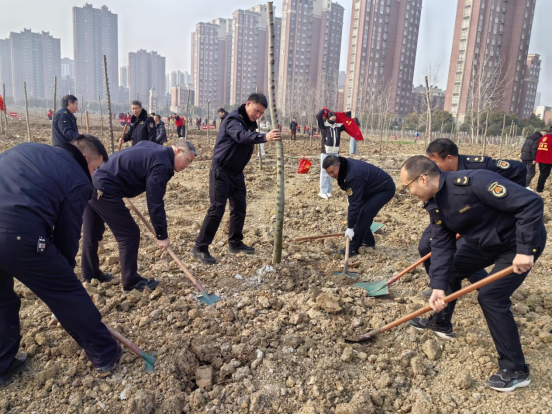 上午8时30分许,植树点活动现场,党旗飘扬,党员干部职工们热情高涨、干劲十足。大家分工协作、密切配合,挥锹铲土、扶苗填坑、踩实浇水,每一道工序都一丝不苟。党员干部职工充分发挥先锋模范作用,扛锹扶苗,用汗水浇灌希望,以实干诠释担当。经过一上午的辛勤劳作,乌桕树苗整齐扎根,在春日里迎风挺立,成为城市生态画卷中一抹鲜亮的生机。
