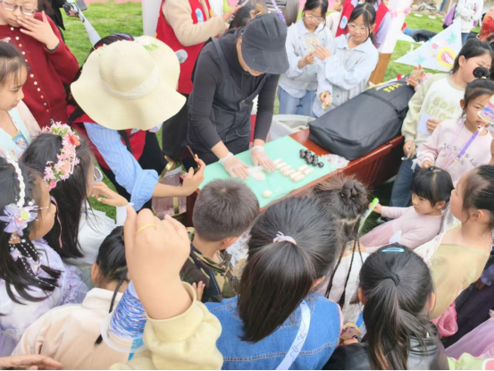 随后,春日“樱阅会"优雅上演。特邀小嘉宾陈亦渔同学为大家带来古筝演奏《珊瑚颂》等经典曲目,悠扬的古乐声与樱花芬芳交织,为活动增添了雅致韵味。手工体验区里,亲子家庭其乐融融,孩子们在志愿者和家长指导下,彩色风筝、小马拨浪鼓、樱花风铃等创意作品在樱花树下一一绽放。