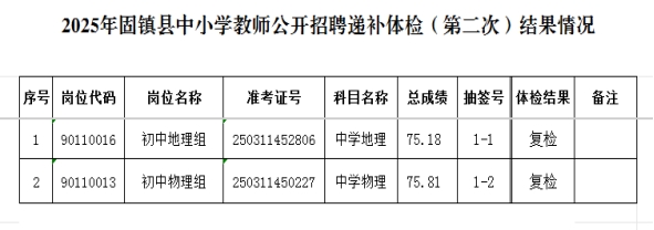 按照《2025年度固镇县中小学教师公开招聘公告》规定,现将递补体检(第二次)结果情况进行公布: