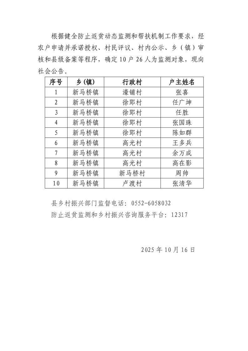 固镇县确定监测对象名单公告(2025年第十六批)