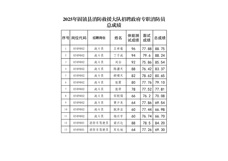2025年固镇县消防救援大队招聘政府专职消防员总成绩