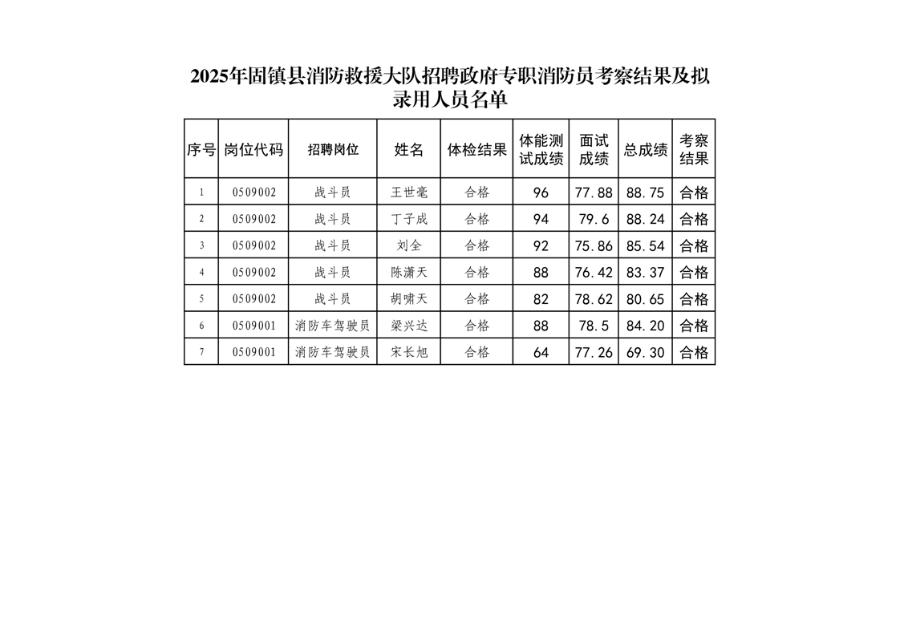 根据《2025年固镇县消防救援大队招聘政府专职消防员公告》要求,经报名、体检、面试、考察等程序,共7名同志符合本次招聘录用条件。