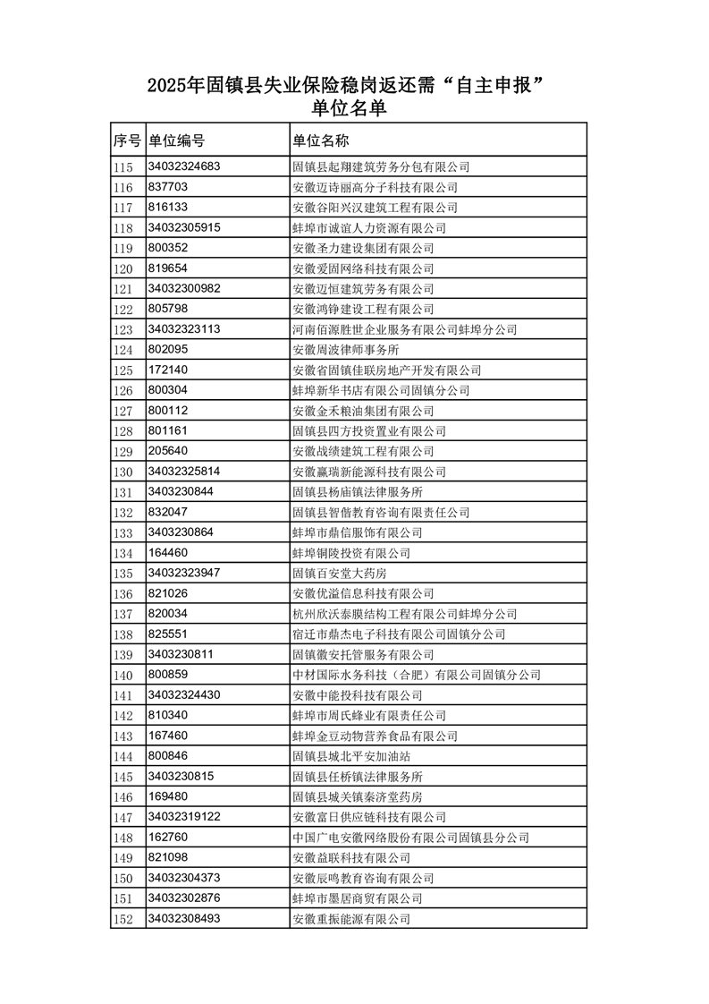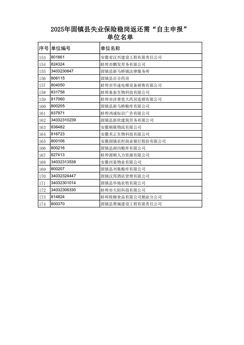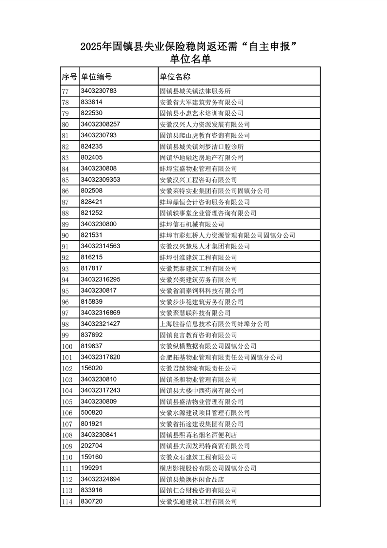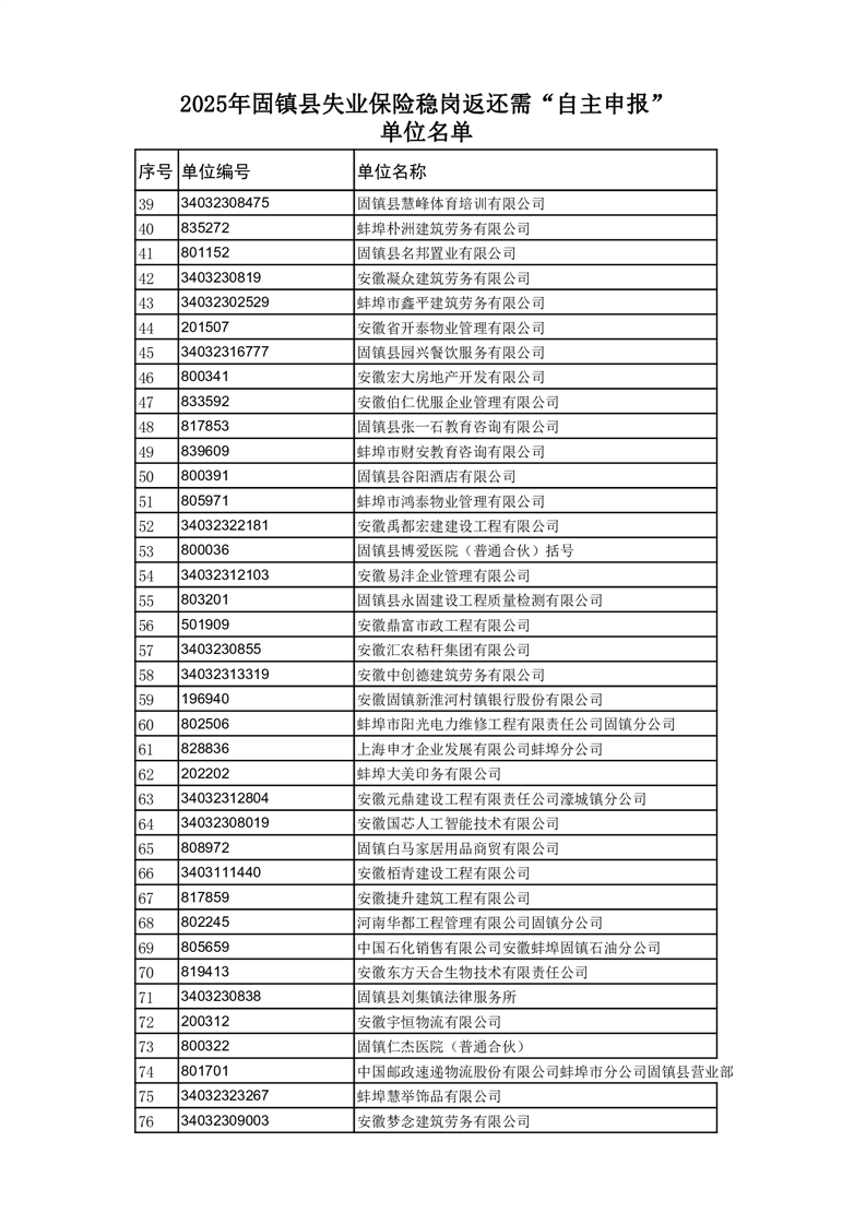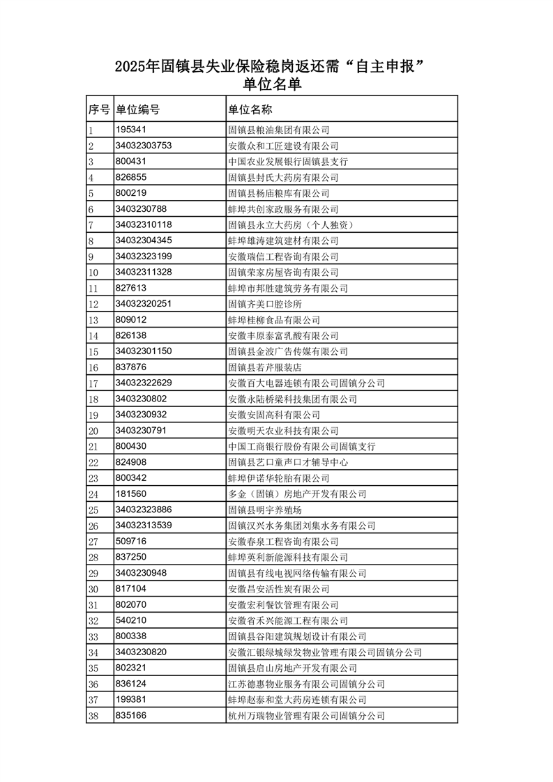 2025年固镇县失业保险稳岗返还需“自主申报”单位的公示