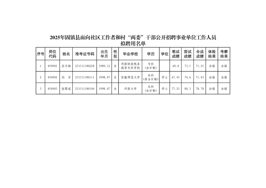 根据《2025年固镇县面向社区工作者和村“两委”干部公开招聘事业单位工作人员公告》规定,经网上报名和资格初审、统一笔试、资格复审、面试、体检、考察等程序,现将谷冬妹等3名拟聘用人员进行公示,公示期5个工作日,公示时间从2026年1月15日至1月21日。如有异议,请于公示期间及时向县纪委监委驻县法院纪检监察组或县人社局反映。