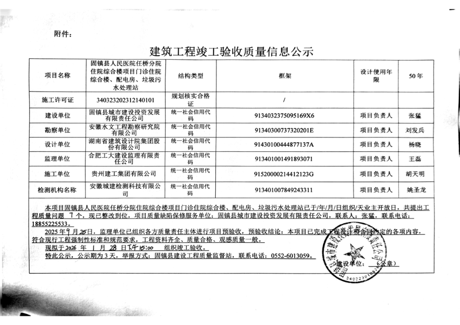 固镇县人民医院任桥分院住院综合楼项目门诊住院综合楼、配电房、垃圾污水处理站建筑工程竣工验收质量信息公示