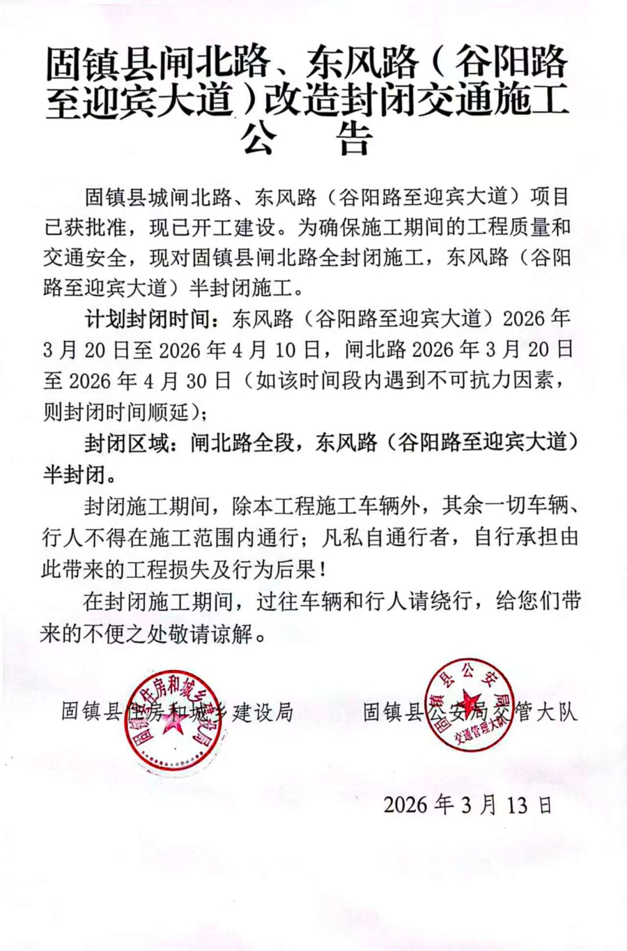 固镇县闸北路、东风路(谷阳路至迎宾大道)改造封闭交通施工公告