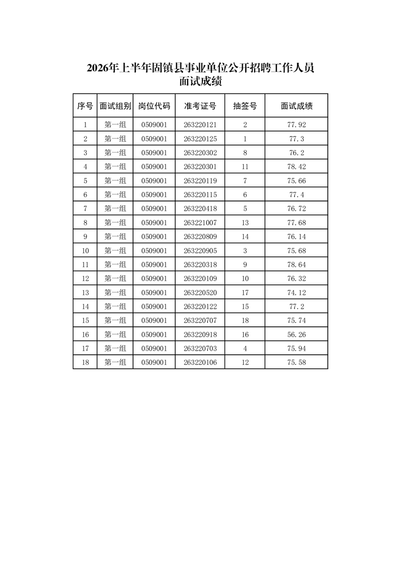 2026年上半年固镇县事业单位公开招聘工作人员面试成绩