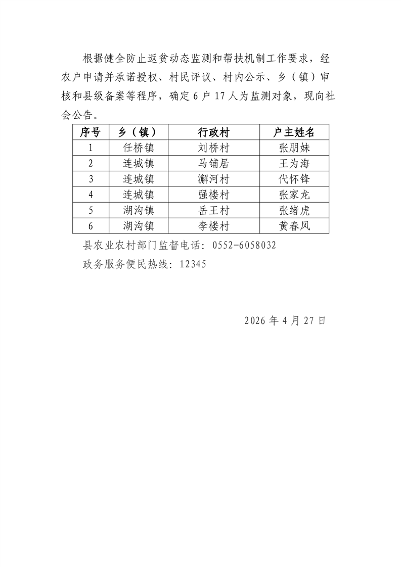 固镇县确定监测对象名单公告(2026年第六批)