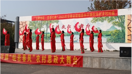 次日,封寺村村晚接力上演。广场舞《映山红》以灵动的舞步复刻红色记忆,让赤诚与热烈在旋转的裙摆间代代流淌;泗州戏《买良心》则凭借鲜活的剧情传递诚信美德,悠扬婉转的唱腔颂扬向善初心。演员们的表演唤醒了村民们“家门口看大戏”的温暖记忆,现场掌声、喝彩声此起彼伏,洋溢着浓浓的乡情乡韵。