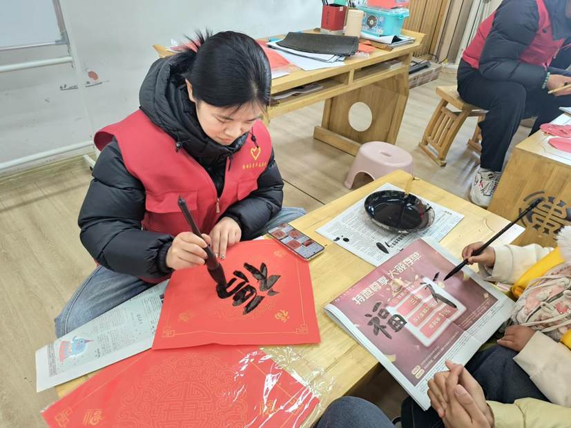在送春联活动现场,红纸铺展、墨香四溢。学生们练习挥毫泼墨,一幅幅寓意吉祥、格调喜庆的“福”字跃然纸上。大家巧手翻飞、折叠剪裁,普通红纸化作灵动的春字、精巧的窗花与吉祥纹样,线条流畅、栩栩如生。一句句新春问候、一张张幸福笑脸,让传统文化在烟火气中焕发生机,让新春祝福直达民心。
