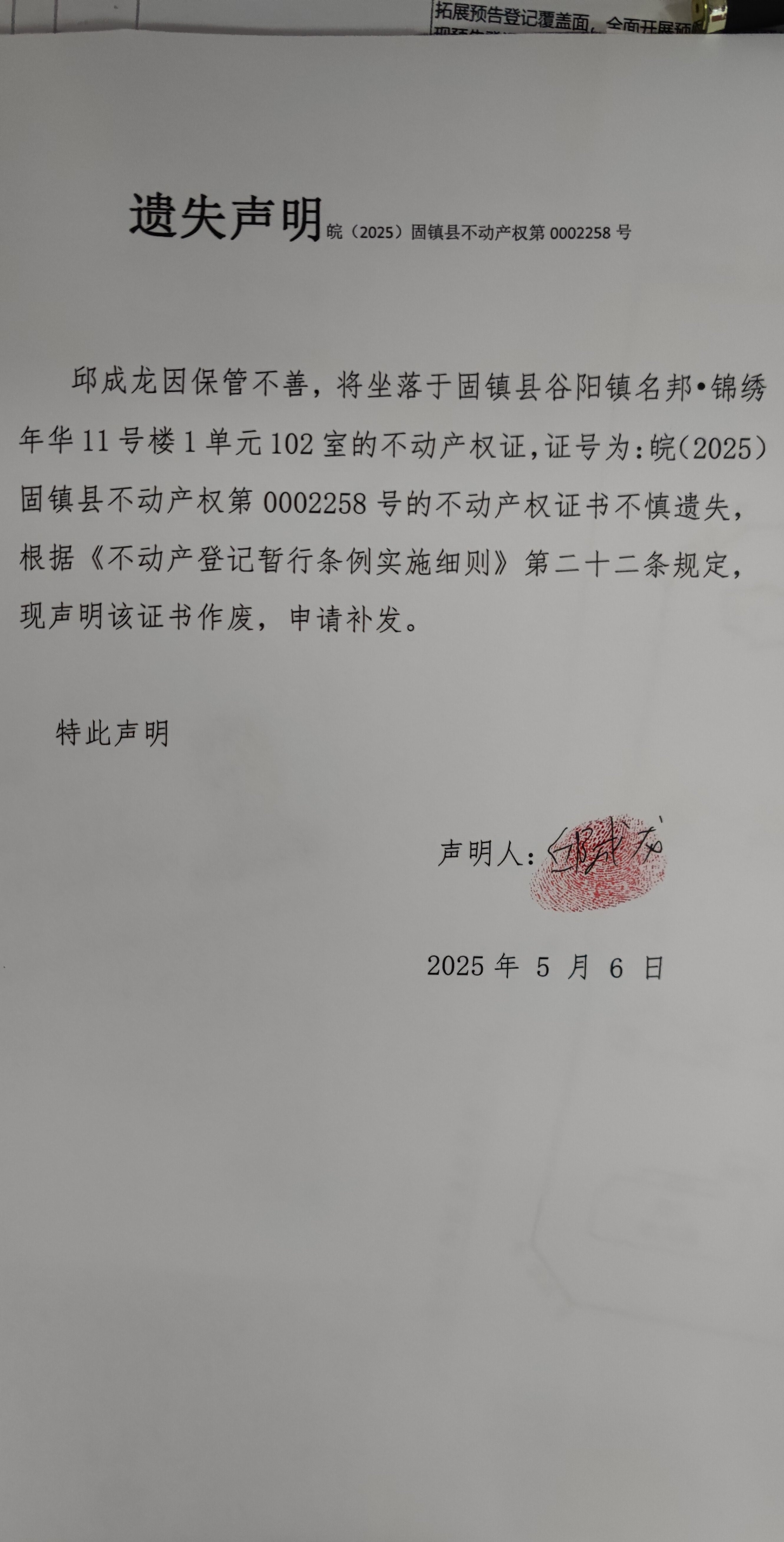 遗失声明【皖(2025)固镇县不动产权第0002258号】