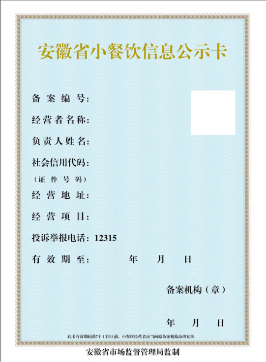 第十七条 《安徽省小餐饮信息公示卡》应当载明下列事项:备案编号、经营者名称、负责人姓名、社会信用代码(证件号码)、经营地址、经营项目、投诉举报电话、有效期限、备案机构、备案日期、二维码等信息。