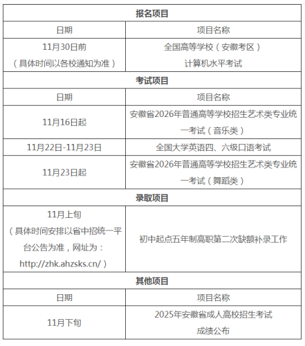 安徽省2025年11月教育招生考试月历