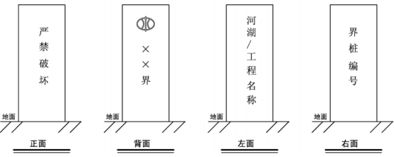 (2)标示:桩地面以上各面均应标注,其中正面、背面应采用英文标注,左面、右面可采用喷涂方式标注。正面标注“严禁破坏”4个汉字;长方体桩背面标注中国水利标志图形 和“管理范围界”5个汉字,其中“管理范围界”可根据河湖或水利工程类型用“河界”“湖界”等文字代替;长方体桩左面标注河湖或水利工程名称;长方体桩右面标注界桩编号。