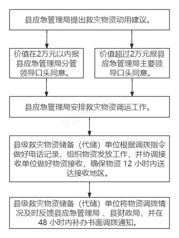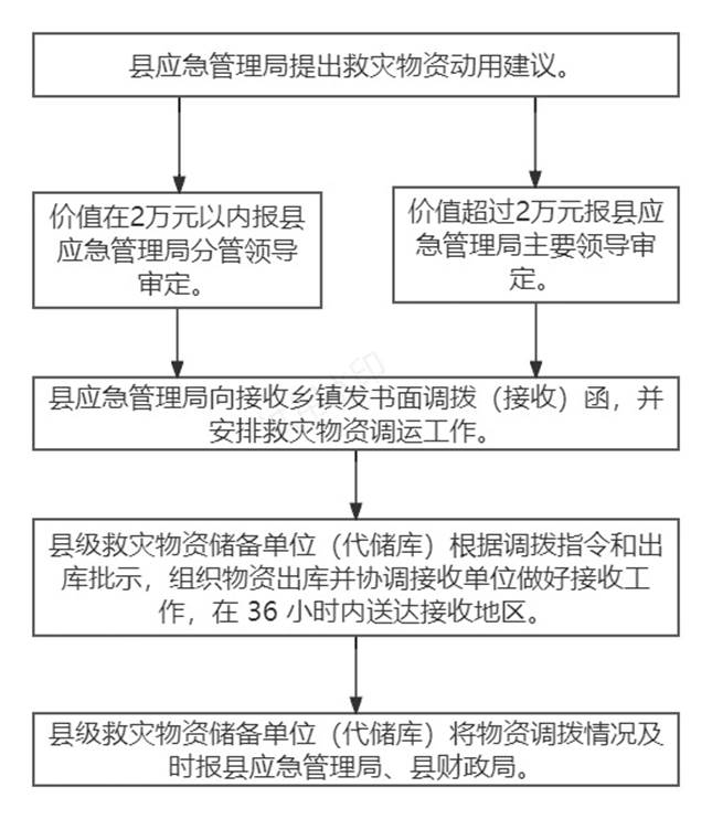 1.县应急管理局根据灾情形势提出县级救灾物资动用方案,通过书面形式向受灾乡镇分别发出动用指令并抄送县财政局。