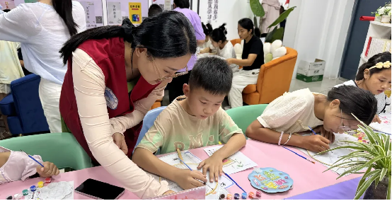 最热闹的要数互动体验环节啦!在“穿针引线”小游戏中,重现古人乞巧的场景,参与者专注地比拼手速,既紧张又有趣;小读者们则围坐在一起绘制绘画团扇,拿起画笔在素白扇面上勾勒星辰花鸟等图案,稚嫩的笔触里满是对七夕文化的美好想象;编绳手工区更是欢声笑语不断,在志愿者老师的耐心指导下,一根根彩绳在指尖穿梭,变成了一件件精美的手工作品。大家互相交流技巧,彼此帮助,不仅学会了传统手艺,更收获了满满的友谊和快乐。