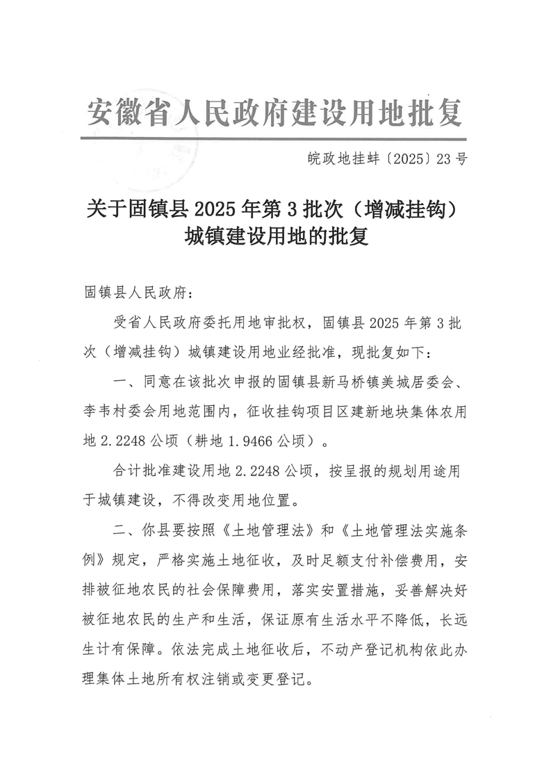 关于固镇县2025年第3批次(增减挂钩)城镇建设用地的批复