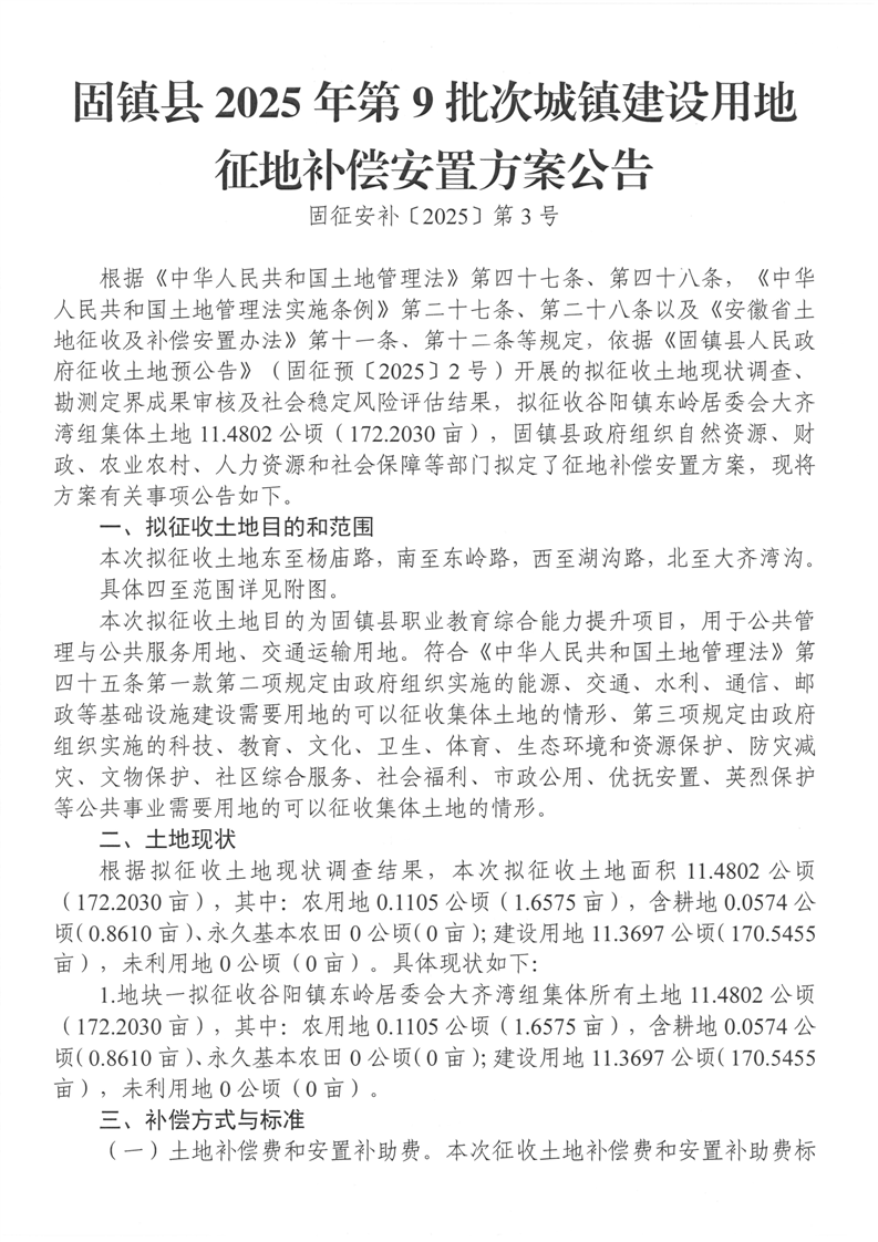 固镇县2025年第9批次城镇建设用地征地补偿安置方案公告(固征安补〔2025〕3号)