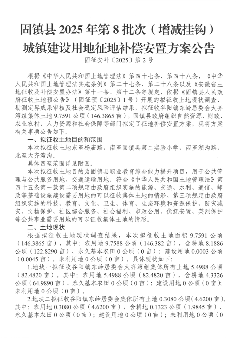 固镇县2025年第8批次(增减挂钩)城镇建设用地征地补偿安置方案公告(固征安补〔2025〕2号)