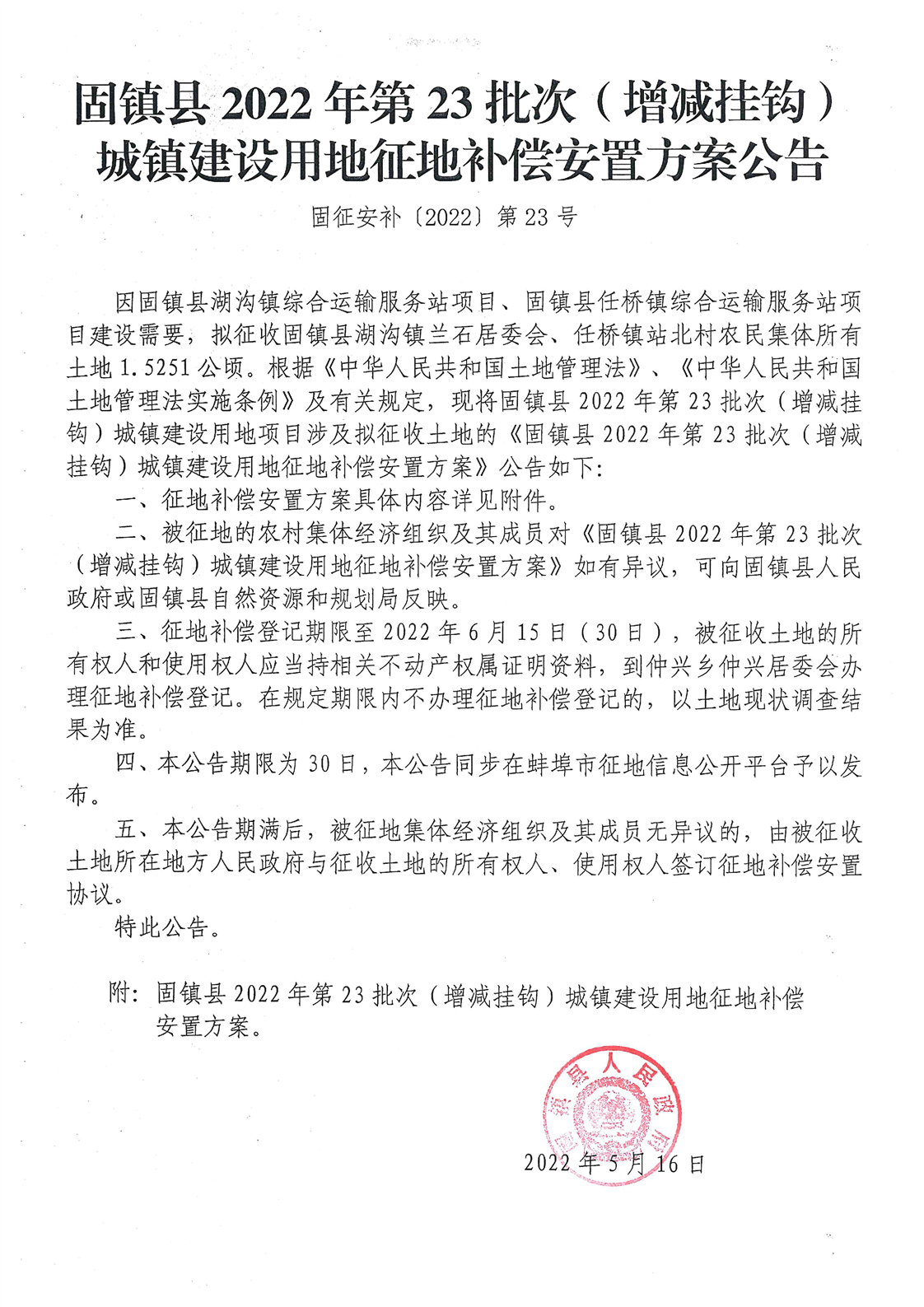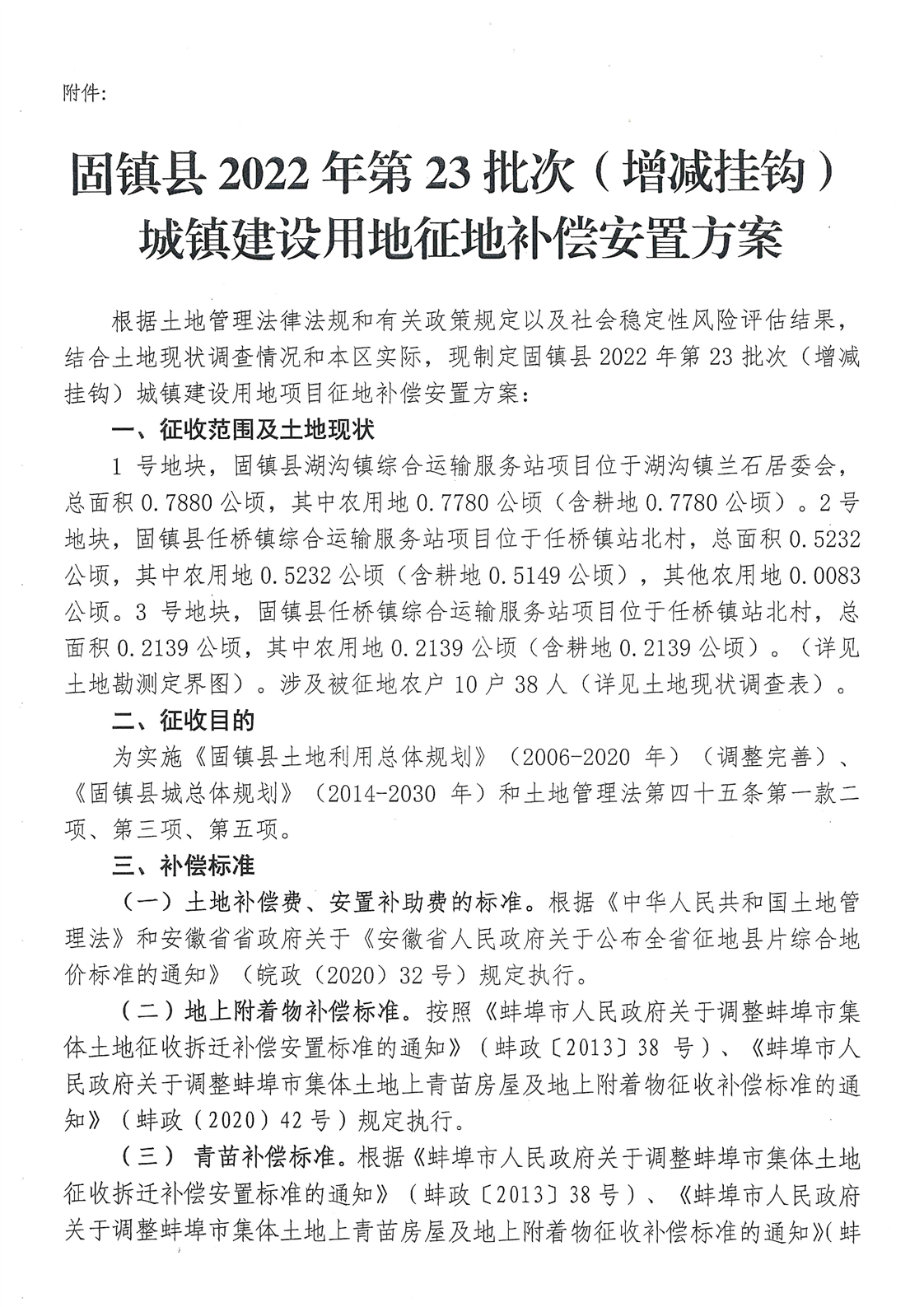 固镇县2022年第23批次(增减挂钩)城镇建设用地征地补偿安置方案公告