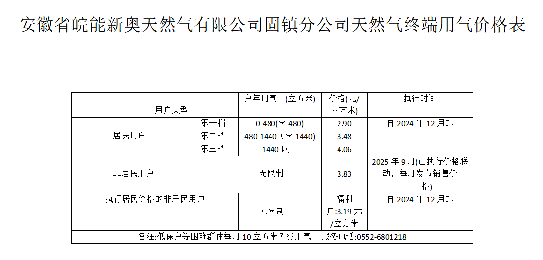 安徽皖能新奥天然气有限公司固镇分公司天然气9月销售价格公示