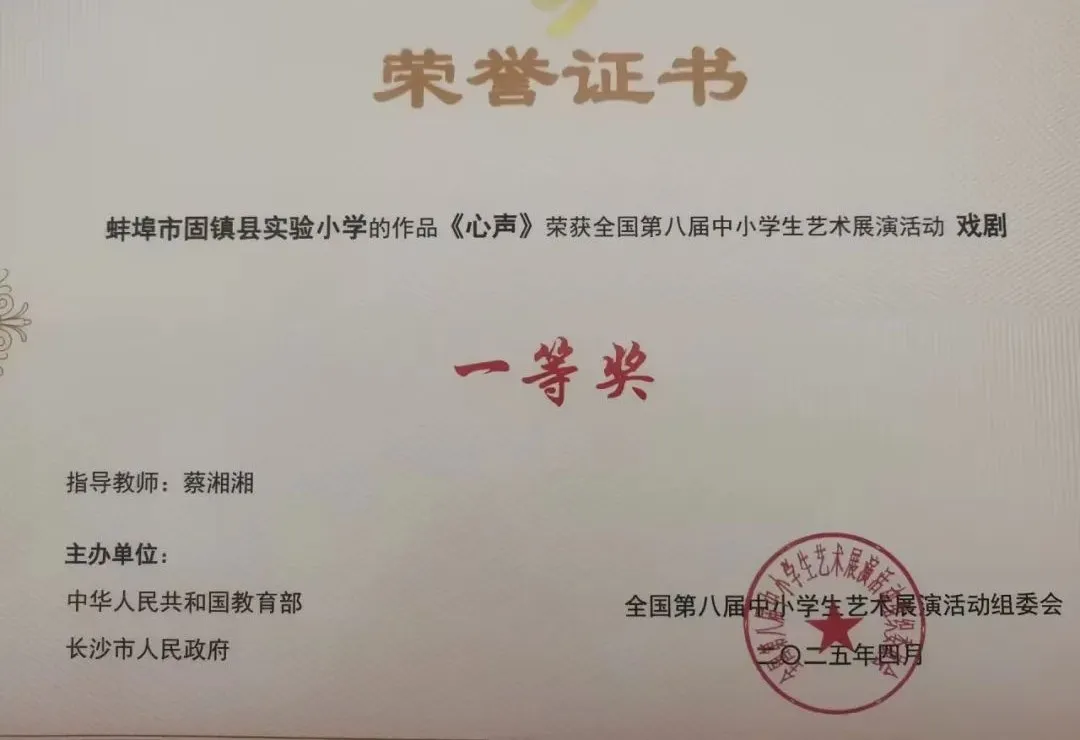 固镇县实验小学《心声》节目荣获全国戏剧类表演一等奖、优秀创作奖